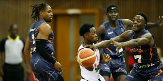 Nairobi City Thunder's Ken Wachira (right) battles for the ball with teammates Uche Ireogbe and Garang Diing against Bravehearts' Faad Billy (centre) during the Africa Champions Clubs Road to Basketball Africa League 2025 Elite 16 East Africa Division qualifiers at the Moi International Sports Centre, Gymnasium on 1 December 1, 2024.