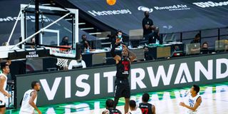 Patriots centre Bush Wamukota attempts a three-point shot during their Basketball Africa League Group A match against Madagascar’s Gendarmerie Nationale Basketball Club (GNBC) at Kigali Arena, Rwanda on May 19, 2021.