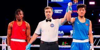 Estonian referee Moris Punho controversially declares China’s Wang Xiaomeng the winner of the light-heavyweight fight against Kenya’s Elizabeth Andiego at the 14th IBA Women’s World Boxing Championships in Nis, Serbia, on March 13, 2025.