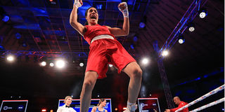 Robert Okaka of Kenya (left) celebrates after beating Vinogradov Anton of Estonia at the ongoing International Boxing Association (IBA) fight in Dubai.