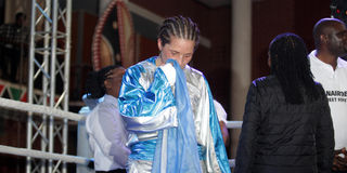 Edith Soledad of Argentina reacts after losing to Kenya’s Sarah “Ängel of War” Achieng in their World Boxing Foundation (WBF) Women's World super lightweight title bout at Charter Hall, Nairobi on June 10, 2023.