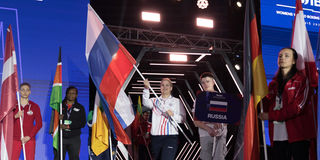 Team Kenya captain, light-heavyweight Elizabeth Andiego (centre), with other flagbearers during the opening ceremony of the IBA Women's World Boxing Championships in Nis, Serbia, on March 8, 2025.