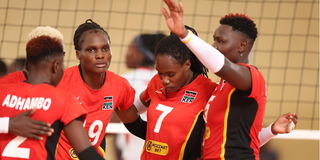 Kenya's opposite hitter Sharon Chepchumba (right) celebrates a point with teammates Veronica Adhiambo (left), Edith Wisa (second left) and Emmaculate Nekesa (second right) during their Africa Nations Championship Group B match against Uganda at the Complexe Sportif Mfandena in Yaounde, Cameroon on August 18, 2023.