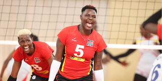 Kenya's opposite hitter Sharon Chepchumba (right) celebrates a point with middle blocker Trizah Atuka during their Africa Nations Championship Group B match against Uganda at the Complexe Sportif Mfandena in Yaounde, Cameroon on August 18, 2023.