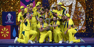 Australia's players celebrate with the trophy after winning the 2023 ICC Men's Cricket World Cup one-day international (ODI) final match against India at the Narendra Modi Stadium in Ahmedabad on November 19, 2023.