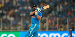 India's captain Rohit Sharma plays a shot during the 2023 ICC Men's Cricket World Cup one-day international (ODI) match between India and Pakistan at the Narendra Modi Stadium in Ahmedabad on October 14, 2023.