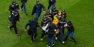 Senegal fans clash with security as fans invade the pitch after Morocco were awarded a penalty following a VAR review.