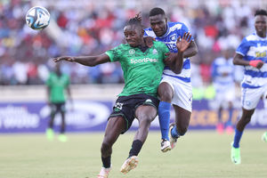 Gor Mahia fan and singer Leonard “Taya Dok” Onyango (centre) leads in celebration after K'Ogalo beat Kenya Police 2-0 in a Kenyan Premier League match at Nyayo National Stadium, Nairobi on November 9, 2025.