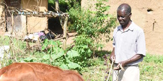 Former football player Joram Roy looks after his cow at his Navakholo home in Kakamega County.