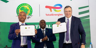 Confederation of African Football President Patrice Motsepe (left) with Patrick Pouyanné, Chairman and CEO of TotalEnergies (right) and Tanzania Football Federation President Wallace Karia, after extending their partnership.