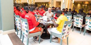 President William Ruto with Harambee Stars players at their team hotel in Upper Hill, Nairobi on August 2, 2025.