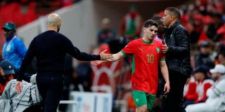 Morocco's Brahim Diaz shakes hands with coach Walid Regragui after being substituted during their CAF Africa Cup of Nations Round of 16 match against Tanzania at Prince Moulay Abdellah Stadium, Rabat, Morocco on January 4, 2026