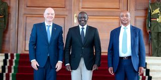 President William Ruto (centre) with Confederation of Africa Football (CAF) President Patrice Motsepe (right) and the Federation International De Football (Fifa) president Gianni Infantino at State House Nairobi on August 30, 2025.