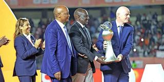 (From left) CAF president Patrice Motsepe, Kenyan President William Ruto and FIFA President Gianni Infantino hand over the trophy to Morocco during their CHAN final at Moi International Sports Centre, Kasarani on August 30, 2025.