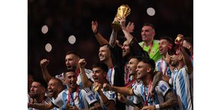 Argentina's forward #10 Lionel Messi (centre) holds up the FIFA World Cup Trophy as he celebrates with teammates winning the Qatar 2022 World Cup final football match between Argentina and France at Lusail Stadium in Lusail, north of Doha on December 18, 2022.