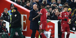 Liverpool's Alexander Isak shakes hands with manager Arne Slot after he is substituted during their English Premier League match Sunderland at Anfield, Liverpool, Britain on December 3, 2025.