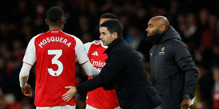 Arsenal's Jurrien Timber comes on as a substitute to replace Cristhian Mosquera after sustaining an injury as manager Mikel Arteta looks on during their English Premier League match against Brentford at Emirates Stadium, London, Britain on December 3, 2025.