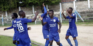 Bandari winger Abdallah Hassan (right) celebrates his goal against Zoo Kericho with his team mates during their SportPesa Premier League match at the Mbaraki Sports ground in Mombasa on May 19, 2019.