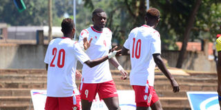 Harambee Stars forward Abdallah Hassan (left), striker Oscar Wamalwa (centre) and midfielder Kenneth Muguna celebrate a goal during their Cecafa Senior Challenge Cup third place play-off match at Lugogo Stadium in Kampala on December 19, 2019.