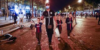 Paris Saint-Germain (PSG) supporters walk on the Champs-Elysees in Paris on August 23, 2020, after the end of their Uefa Champions League final match against Bayern Munich at the Luz stadium in Lisbon.