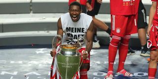 Bayern Munich's Austrian defender David Alaba celebrates with the trophy after their Uefa Champions League final match win against Paris Saint-Germain at the Luz stadium in Lisbon on August 23, 2020.
