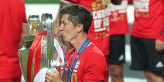 Bayern Munich's Polish forward Robert Lewandowski celebrates with the trophy after their UEFA Champions League final match win against Paris Saint-Germain at the Luz stadium in Lisbon on August 23, 2020.