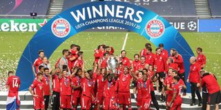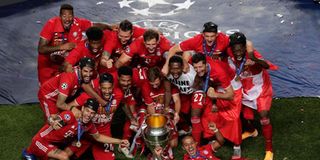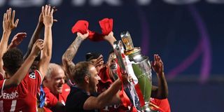 Bayern Munich players celebrate with the trophy after their Uefa Champions League final match win against Paris Saint-Germain at the Luz stadium in Lisbon on August 23, 2020.
