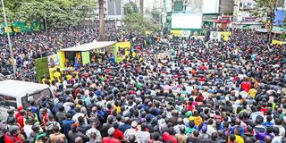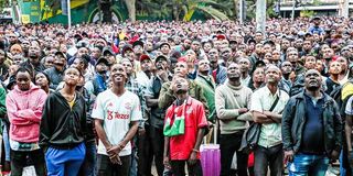 Fans turn out in large numbers along Moi Avenue in Nairobi on August 22, 2025, to watch the CHAN clash between Harambee Stars and Madagascar.