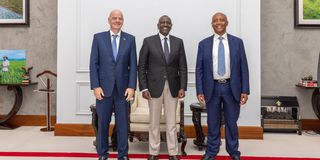 Fifa President Gianni Infantino, President William Ruto, and CAF President Patrice Motsepe at State House, Nairobi, on August 30, 2025.