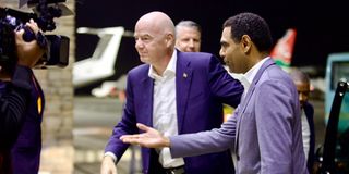Hussein with Gianni Infantino: Fifa President Gianni Infantino is welcomed by Football Kenya Federation boss Hussein Mohammed upon his arrival in Nairobi on August 29, 2025 for the 2024 African Nations Championships final.