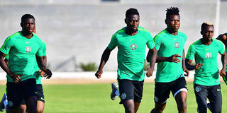 Nigeria's midfielder Wilfred Ndidi (centre) and Nigeria's forward Samuel Kalu (central-left) attend a training session in Alexandria, northern Egypt, on June 21, 2019, on the eve of their 2019 Africa Cup of Nations match against Burundi.