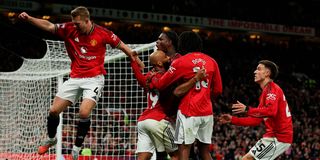 Manchester United's Bryan Mbeumo celebrates scoring their fourth goal against Brighton with teammates at Old Trafford, Manchester, Britain on October 25, 2025.