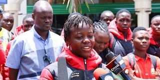 Junior Starlets midfielder Lindey Weey speaks to the media after their arrival at Jomo Kenyatta International Airport (JKIA) on March 9, 2025.