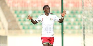 Kenya's forward Cliff Nyakeya celebrates after scoring the second goal during their international friendly match ahgainst Zambia at Nyayo National Stadium.
