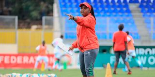 Under-17 girls’ Junior Starlets Team Head Coach Mildred Cheche in action during a training session ahead of the 2024 World Cup qualifier match against Ethiopia at Dandora Stadium in Nairobi on May 7, 2024.
