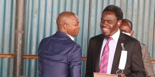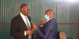 Football Kenya Federation president Nick Mwendwa (left) talks to his lawyer, Law Society of Kenya president Nelson Havi, at the Milimani Law Courts on November 17, 2021 before the delivery of a ruling to determine whether police will be allowed to detain him for 14 days.