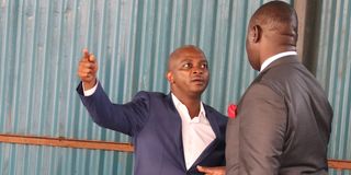 Football Kenya Federation president Nick Mwendwa (right) talks to lawyer Charles Njenga at the Milimani Law Courts on November 17, 2021 as they wait for the delivery of a ruling to determine whether police will be allowed to detain him for 14 days.