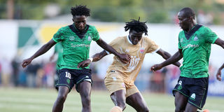 Gor Mahia's Austin Odhiambo (left) and teammate Alpha Onyango vie for the ball with Nairobi City Stars' Kelvin Juma during their FKF Premier League match on May 15, 2025 at Dandora Stadium.