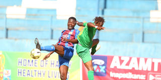 Mara Sugar’s Makari Evans (left) vies for the ball with Chris Opondo of Bidco during their Football Kenya Federation Premier League match at Kenyatta Stadium, Machakos County on November 3, 2024.