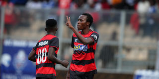 AFC Leopards' Kaycie Odhiambo (right) celebrates his goal against Nairobi City Stars during their FKF Premier League match on February 2, 2025 at Dandora Stadium.