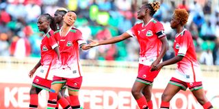 Harambee starlets players react during their 2024 Women's Africa Cup of Nations qualifying match against Botswana at Nyayo National Stadium on November 29, 2023.
