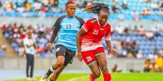 Harambee Starlets winger Elizabeth Wambui (right) vies for the ball with Botswana midfielder Dithebe Keutumtse at The National Stadium in Gaborone, Botswana during the second match of their 2024 Women Africa Cup of Nations (WAFCON) qualifying match on December 5, 2023.