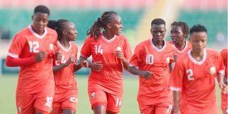 Harambee Starlets players celebrate a goal against the Gambia in a first leg match of the final round of 2026 Women Africa Cup of Nations qualifiers at Nyayo National Stadium on October 24, 2025.