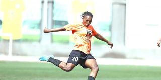 Kenya and Al Ahli Bank forward Janet Moraa prepares to strike the ball during their Egyptian Women’s Premier League match against Maadi at the National Bank ground in Cairo on May 3, 2025.