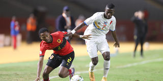 Angola's Antonio Da Sila (left) fights for the ball with Agee Basiala of the Democratic Republic of Congo during their Group 'A' match of the 2024 African Nations Championship at Moi International Sports Centre, Kasarani, on August 14, 2025.