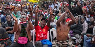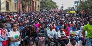 Fans fill Tom Mboya Street in Nairobi on August 17, 2025, rallying behind the Harambee Stars as they face Zambia at Kasarani Stadium, in a spirited event hosted by Nairobi City County.