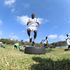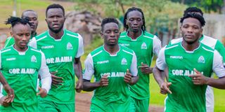 Gor Mahia's Cameroonian midfielder Bertrand Konfor (right) jogs alongside his teammates during a training session at Riverside grounds in Ruaka, Nairobi on September 22, 2019.