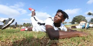 Gor Mahia's Cameroonian midfielder Bertrand Konfor stretches during a light training session at Riverside grounds in Ruaka on September 22, 2020.