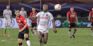 This photo taken on September 10, 2020 shows Qingdao Huanghai's Joseph Minala (left) kicking the ball during their Chinese Super League match (CSL) against Shanghai SIPG in Suzhou in China's eastern Jiangsu province.
