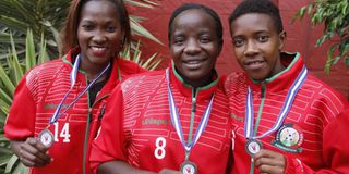 From left: Harambee Starlets striker Esse Akida, Ann Aluoch and skipper Mary Kinuthia pose for photos with their silver medals on arrival at the Jomo Kenyatta International Airport on September 21, 2016 from Uganda where they took part in the Cecafa Women Championships.